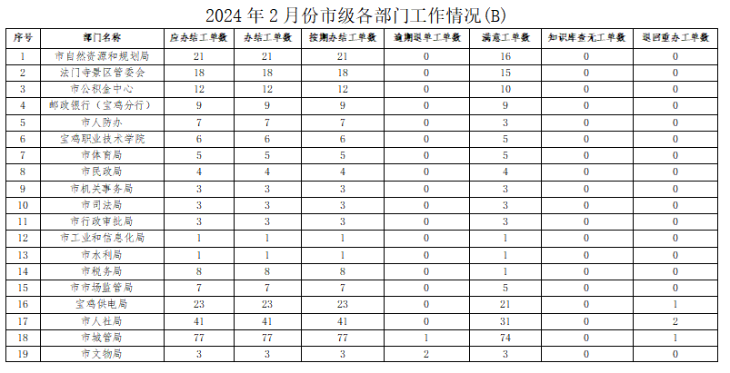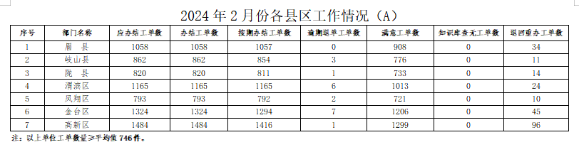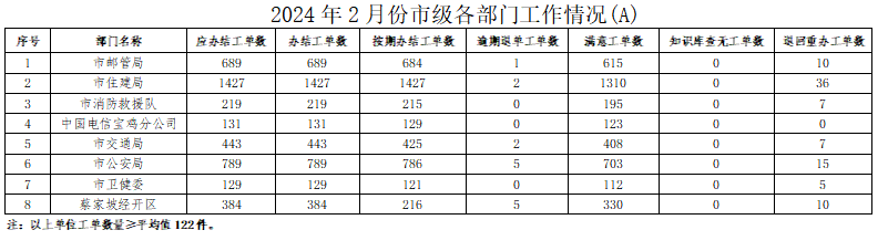 2024年2月份,寶雞市12345政務(wù)服務(wù)便民熱線(“有問必應(yīng)、接訴即辦”平臺(tái))受理企業(yè)和群眾訴求39020件,應(yīng)辦結(jié)38286件,辦結(jié)38186件,總體辦結(jié)率99.73%。其中12345熱線渠道受理訴求38683件(包括來電37555件、省12345交辦738件、微信公眾號(hào)留言298件、政府網(wǎng)站留言92件),應(yīng)辦結(jié)38006件,辦結(jié)37906件;市長信箱收到來信共280件(其中含重復(fù)信件57件),應(yīng)辦結(jié)223件,辦結(jié)223件;人民網(wǎng)領(lǐng)導(dǎo)留言板留言46件,辦結(jié)46件;西部網(wǎng)留言11件,辦結(jié)11件。