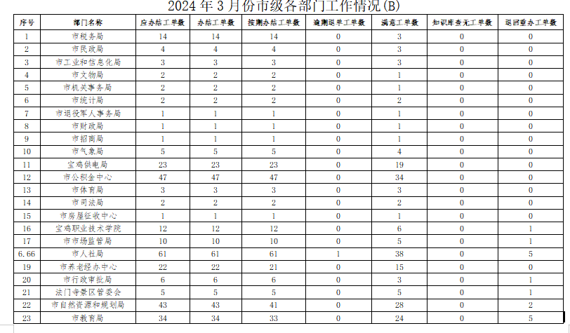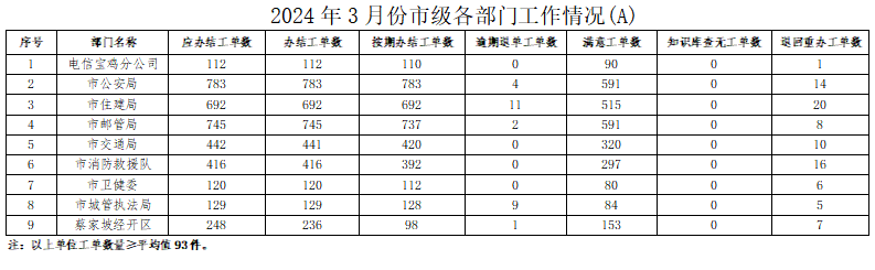 2024年3月份,寶雞市12345政務服務便民熱線(“有問必應、接訴即辦”平臺)受理企業(yè)和群眾訴求35269件,應辦結33555件,辦結33535件,總體辦結率99.94%。其中12345熱線渠道受理訴求34834件(包括來電33788件、省12345交辦605件、微信公眾號留言336件、政府網站留言105件),應辦結33175件,辦結33157件,辦結率99.95%;市長信箱收到來信共325件(其中含重復信件70件),應辦結255件,辦結253件,辦結率99.22%;人民網領導留言板留言85件,應辦結110件,辦結110件;西部網留言15件,應辦結15件,辦結15件。