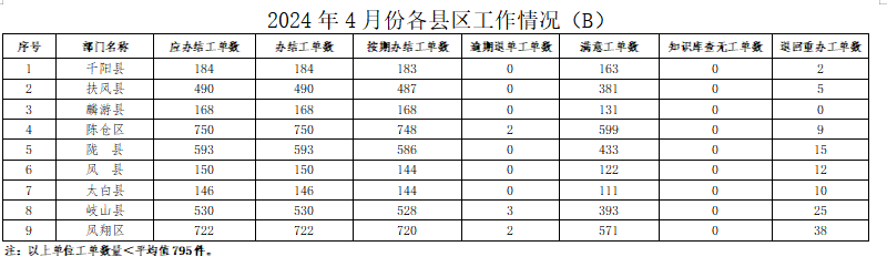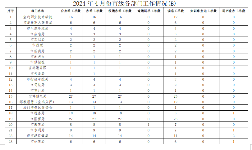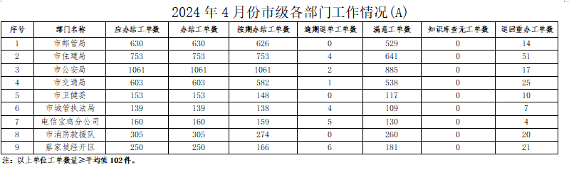 2024年4月份,寶雞市12345政務(wù)服務(wù)便民熱線(“有問(wèn)必應(yīng)、接訴即辦”平臺(tái))受理企業(yè)和群眾訴求39429件,應(yīng)辦結(jié)38836件,辦結(jié)38829件,總體辦結(jié)率99.98%。其中12345熱線渠道受理訴求38971件(包括來(lái)電37622件、省12345交辦739件、微信公眾號(hào)留言455件、政府網(wǎng)站留言155件),應(yīng)辦結(jié)38402件,辦結(jié)38395件,辦結(jié)率99.98%;市長(zhǎng)信箱收到來(lái)信共384件(其中含重復(fù)信件79件),應(yīng)辦結(jié)305件,辦結(jié)305件,辦結(jié)率100%;人民網(wǎng)領(lǐng)導(dǎo)留言板留言63件,應(yīng)辦結(jié)117件,辦結(jié)117件;西部網(wǎng)留言11件,應(yīng)辦結(jié)12件,辦結(jié)12件。