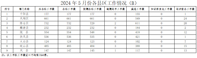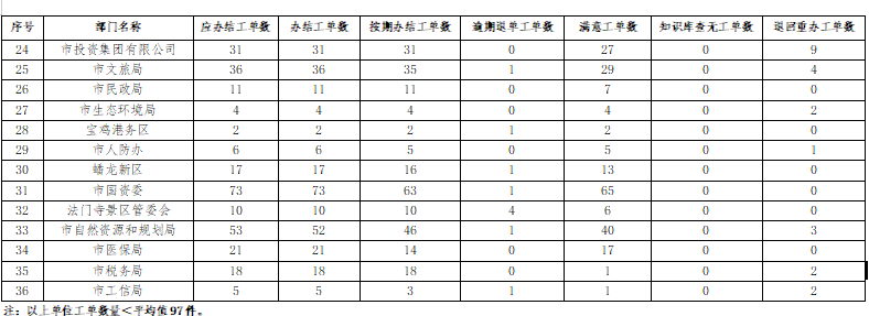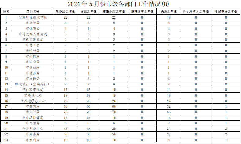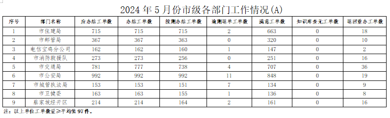 2024年5月份,寶雞12345政務(wù)服務(wù)便民熱線(“有問(wèn)必應(yīng)、接訴即辦”平臺(tái))受理企業(yè)和群眾訴求38377件,應(yīng)辦結(jié)37447件,辦結(jié)37429件,總體辦結(jié)率99.95%。其中12345熱線渠道受理訴求37930件(包括來(lái)電36667件、省12345交辦852件、微信公眾號(hào)留言359件、政府網(wǎng)站留言52件),應(yīng)辦結(jié)37015件,辦結(jié)36998件,辦結(jié)率99.95%;市長(zhǎng)信箱收到來(lái)信共382件,應(yīng)辦結(jié)358件,辦結(jié)357件,辦結(jié)率99.72%;人民網(wǎng)領(lǐng)導(dǎo)留言板留言47件,應(yīng)辦結(jié)61件,辦結(jié)61件;西部網(wǎng)留言18件,應(yīng)辦結(jié)13件,辦結(jié)13件。