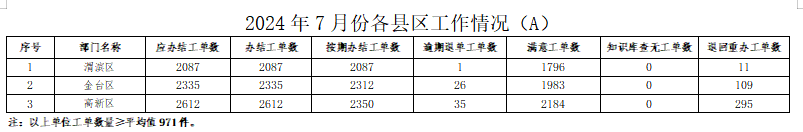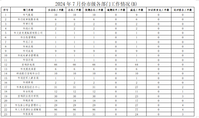 2024年7月份,寶雞市12345政務(wù)服務(wù)便民熱線(“有問(wèn)必應(yīng)、接訴即辦”平臺(tái))受理企業(yè)和群眾訴求43825件,應(yīng)辦結(jié)44021件,辦結(jié)43824件,總體辦結(jié)率99.55%。其中12345熱線渠道受理訴求43206件(包括來(lái)電41076件、省12345交辦1010件、微信公眾號(hào)留言955件、政府網(wǎng)站留言165件),應(yīng)辦結(jié)43431件,辦結(jié)43237件,辦結(jié)率99.55%;市長(zhǎng)信箱收到來(lái)信共515件,應(yīng)辦結(jié)486件,辦結(jié)484件,辦結(jié)率99.59%;人民網(wǎng)領(lǐng)導(dǎo)留言板留言91件,應(yīng)辦結(jié)92件,辦結(jié)91件;西部網(wǎng)留言13件,應(yīng)辦結(jié)12件,辦結(jié)12件。