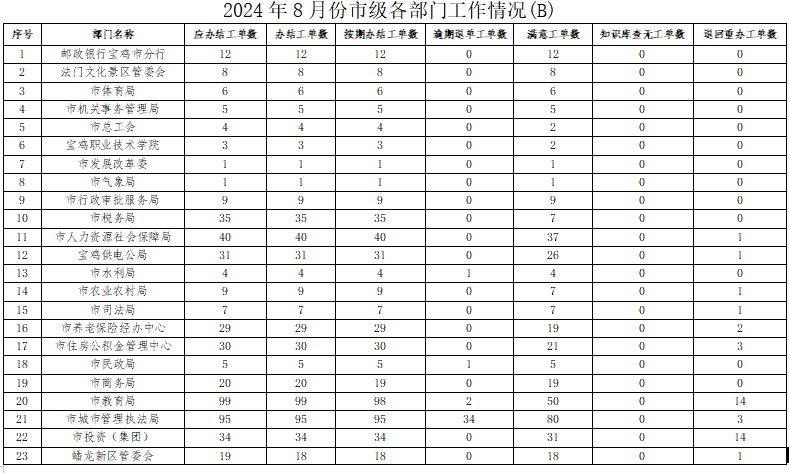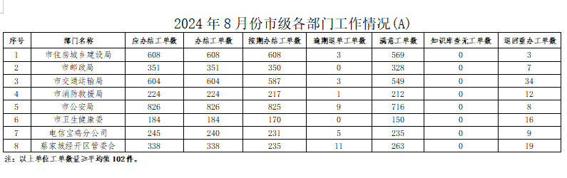 2024年8月份,寶雞市12345政務(wù)服務(wù)便民熱線(“有問必應(yīng)、接訴即辦”平臺)受理企業(yè)和群眾訴求42001件,應(yīng)辦結(jié)40888件,辦結(jié)40753件,總體辦結(jié)率99.67%。其中12345熱線渠道受理訴求41392件(包括來電39005件、省12345交辦1147件、微信公眾號留言1064件、政府網(wǎng)站留言176件),應(yīng)辦結(jié)40263件,辦結(jié)40134件,辦結(jié)率99.68%;市長信箱收到來信共519件,應(yīng)辦結(jié)521件,辦結(jié)519件,辦結(jié)率99.62%;人民網(wǎng)領(lǐng)導(dǎo)留言板留言72件,應(yīng)辦結(jié)93件,辦結(jié)89件;西部網(wǎng)留言18件,應(yīng)辦結(jié)11件,辦結(jié)11件。