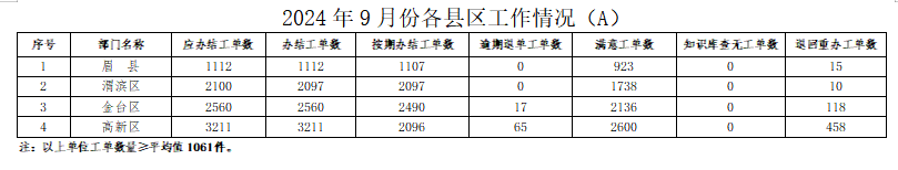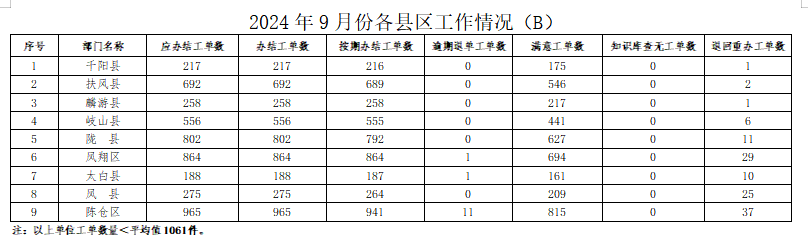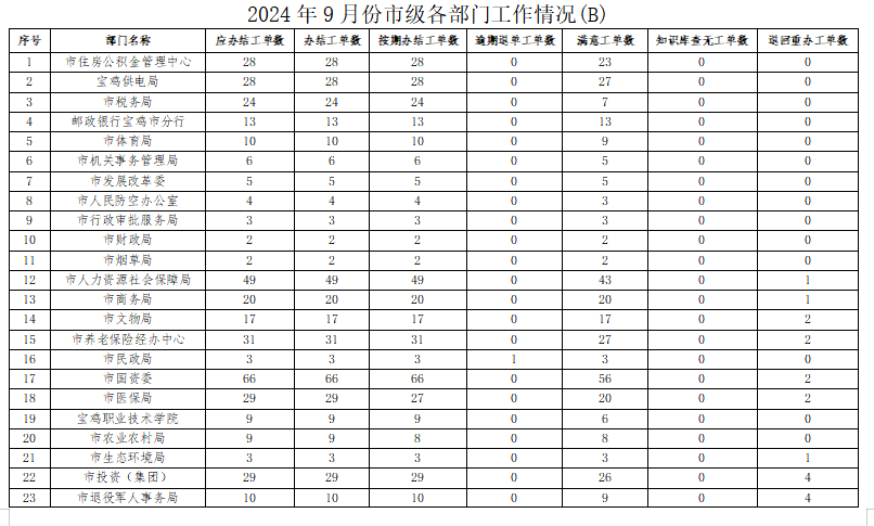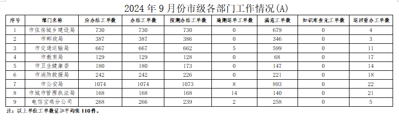 2024年9月份,寶雞市12345政務(wù)服務(wù)便民熱線(“有問(wèn)必應(yīng)、接訴即辦”平臺(tái))受理企業(yè)和群眾訴求42728件,應(yīng)辦結(jié)42088件,辦結(jié)41727件,總體辦結(jié)率99.14%。其中12345熱線渠道受理訴求42056件(包括來(lái)電39622件、省12345交辦1249件、微信公眾號(hào)留言1014件、政府網(wǎng)站留言171件),應(yīng)辦結(jié)41412件,辦結(jié)41063件,辦結(jié)率99.16%;市長(zhǎng)信箱收到來(lái)信共577件,應(yīng)辦結(jié)584件(含8月正在辦理7件),辦結(jié)578件,辦結(jié)率98.97%;人民網(wǎng)領(lǐng)導(dǎo)留言板留言87件,應(yīng)辦結(jié)77件,辦結(jié)73件;西部網(wǎng)留言8件,應(yīng)辦結(jié)15件,辦結(jié)13件。
