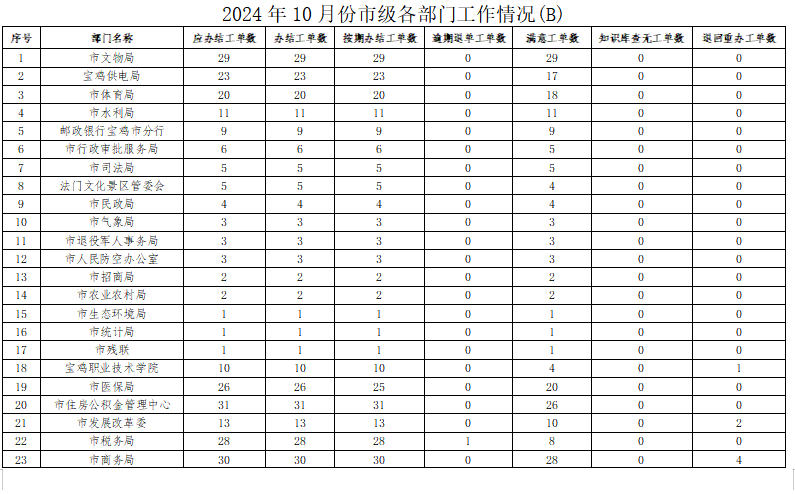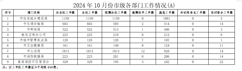 2024年10月份,寶雞市12345政務(wù)服務(wù)便民熱線(“有問(wèn)必應(yīng)、接訴即辦”平臺(tái))受理企業(yè)和群眾訴求39792件,應(yīng)辦結(jié)42647件,辦結(jié)42326件,總體辦結(jié)率99.25%。其中12345熱線渠道受理訴求39218件(包括來(lái)電37073件、省12345交辦1170件、微信公眾號(hào)留言824件、政府網(wǎng)站留言151件),應(yīng)辦結(jié)42050件,辦結(jié)41735件,辦結(jié)率99.25%;市長(zhǎng)信箱收到來(lái)信共473件,應(yīng)辦結(jié)511件(含9月正在辦理38件),辦結(jié)506件,辦結(jié)率99.02%;人民網(wǎng)領(lǐng)導(dǎo)留言板留言89件,應(yīng)辦結(jié)79件,辦結(jié)78件;西部網(wǎng)留言12件,應(yīng)辦結(jié)7件,辦結(jié)7件。