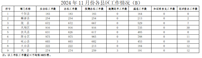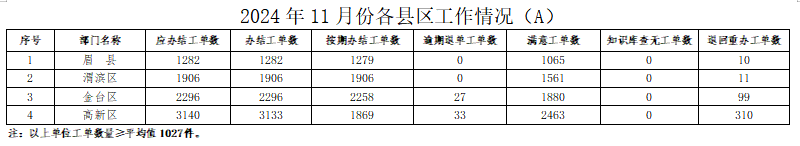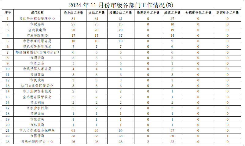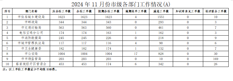 2024年11月份,寶雞市12345政務(wù)服務(wù)便民熱線(“有問必應(yīng)、接訴即辦”平臺)受理企業(yè)和群眾訴求45228件,應(yīng)辦結(jié)41194件,辦結(jié)41098件,總體辦結(jié)率99.77%。其中12345熱線渠道受理訴求44571件(包括來電41857件、省12345交辦1419件、微信公眾號留言1129件、政府網(wǎng)站留言166件),應(yīng)辦結(jié)40627件,辦結(jié)40532件,辦結(jié)率99.77%;市長信箱收到來信共558件,應(yīng)辦結(jié)469件,辦結(jié)468件,辦結(jié)率99.79%;人民網(wǎng)領(lǐng)導(dǎo)留言板留言94件,應(yīng)辦結(jié)87件,辦結(jié)87件;西部網(wǎng)留言5件,應(yīng)辦結(jié)11件,辦結(jié)11件。