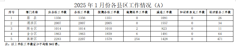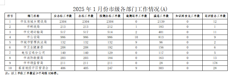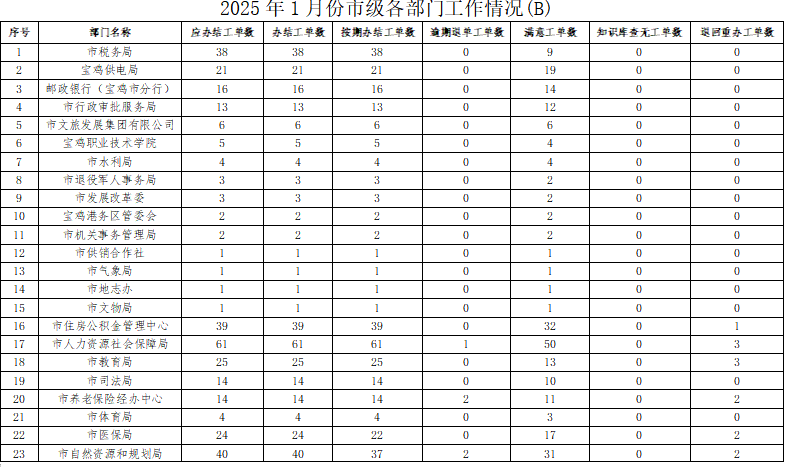 2025年1月份,寶雞市12345政務(wù)服務(wù)便民熱線(“有問必應(yīng)、接訴即辦”平臺(tái))受理企業(yè)和群眾訴求40767件,應(yīng)辦結(jié)41158件,辦結(jié)40797件,總體辦結(jié)率99.12%。其中12345熱線渠道受理訴求40192件(包括來電37958件、省12345交辦1430件、微信公眾號(hào)留言695件、政府網(wǎng)站留言108件、短信平臺(tái)1件),應(yīng)辦結(jié)40548件,辦結(jié)40196件,辦結(jié)率99.13%;市長(zhǎng)信箱收到來信共478件,應(yīng)辦結(jié)515件(含12月正在辦理37件),辦結(jié)508件,辦結(jié)率98.64%;人民網(wǎng)領(lǐng)導(dǎo)留言板留言91件,應(yīng)辦結(jié)89件,辦結(jié)87件;西部網(wǎng)留言6件,應(yīng)辦結(jié)6件,辦結(jié)6件。