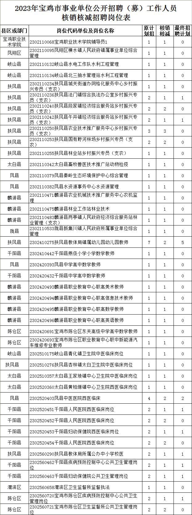 根據(jù)《2023年寶雞市事業(yè)單位公開(kāi)招聘(募)工作人員公告》規(guī)定,對(duì)未達(dá)到規(guī)定開(kāi)考比例的,招聘計(jì)劃數(shù)予以核銷(xiāo)或核減?,F(xiàn)將有關(guān)崗位核銷(xiāo)、核減和最終招聘計(jì)劃崗位情況予以公告。