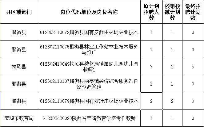 根據(jù)《2023年下半年寶雞市事業(yè)單位公開招聘工作人員公告》規(guī)定,對未達到規(guī)定開考比例的,招聘計劃數(shù)予以核銷或核減。現(xiàn)將有關(guān)崗位核銷、核減和最終招聘計劃情況予以公告。