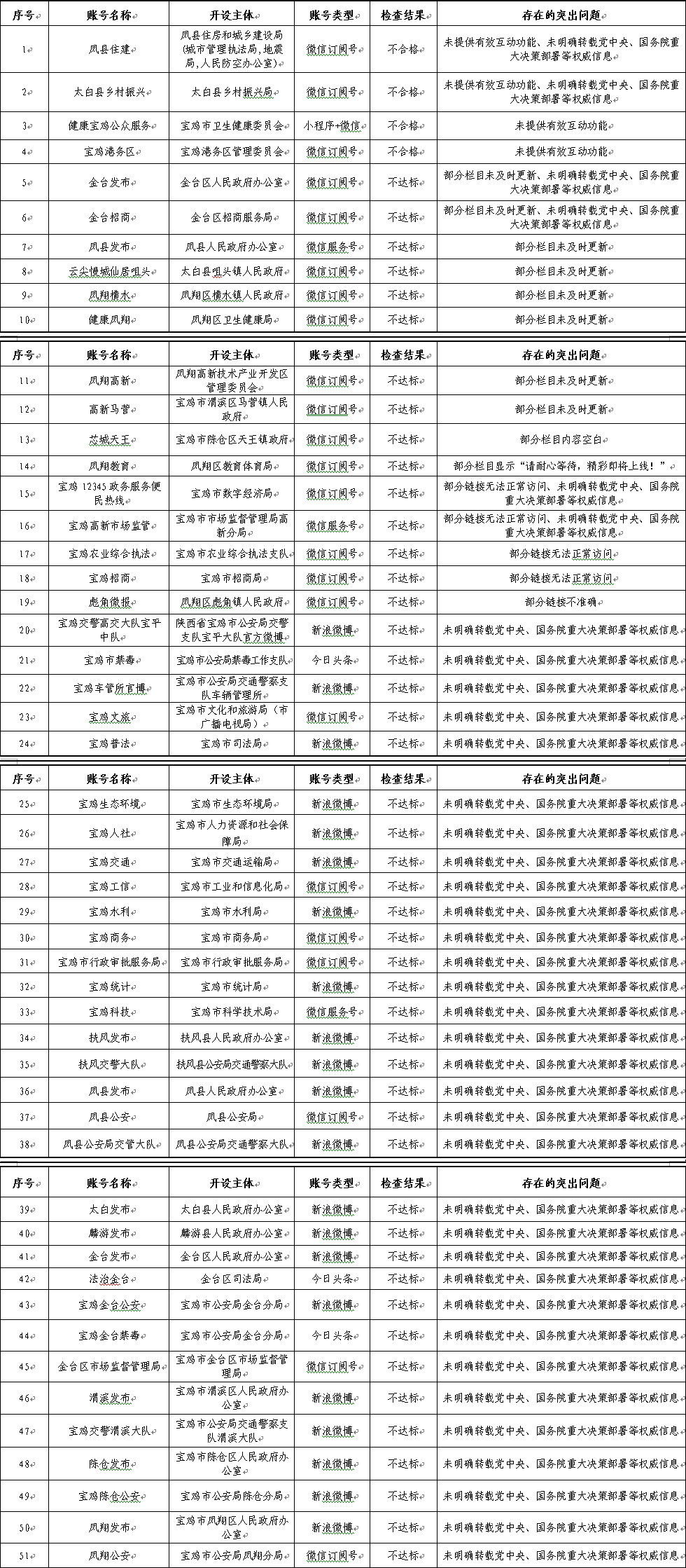 (五)存在漏報的政務新媒體賬號。市公安局開通的“寶雞網(wǎng)警”新浪微博、今日頭條、抖音短視頻、快手短視頻、百家號、微信服務號和“寶雞公安”視頻號政務新媒體,未按程序申請報備和納入平臺監(jiān)管,存在漏報現(xiàn)象。