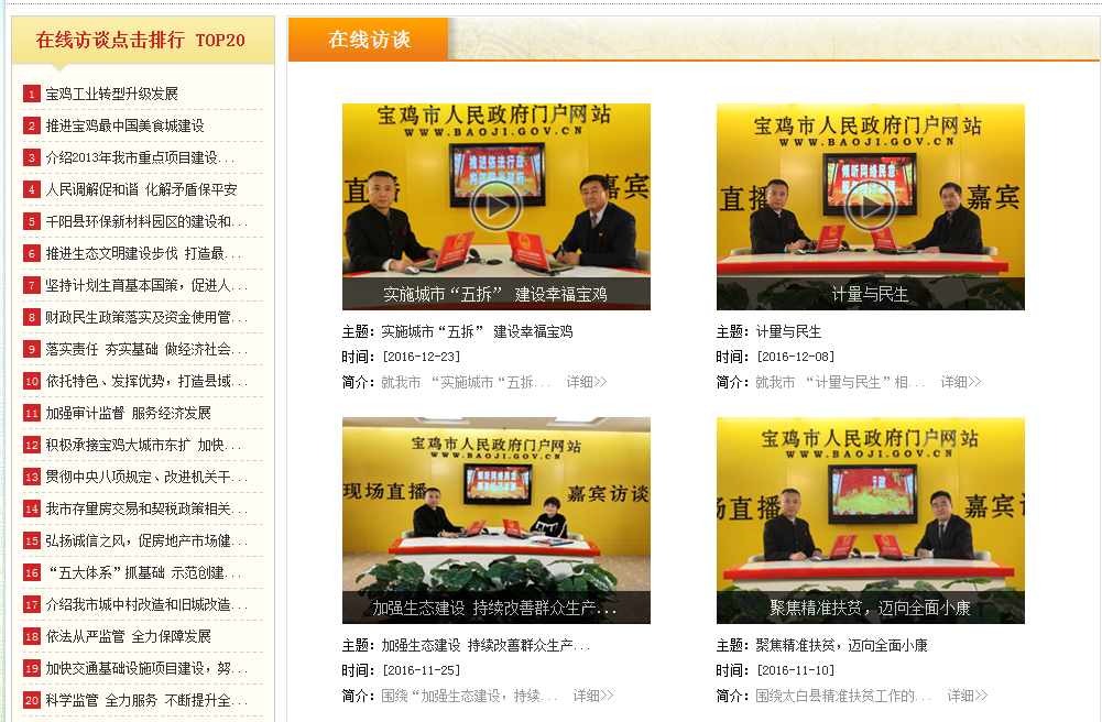 5.圍繞擴(kuò)大政務(wù)開(kāi)放參與推進(jìn)公開(kāi)。一是主動(dòng)做好政策解讀。積極組織各縣區(qū)、各部門(mén)主要負(fù)責(zé)人和相關(guān)專(zhuān)家學(xué)者,通過(guò)召開(kāi)新聞發(fā)布會(huì)、接受訪(fǎng)談、發(fā)表解讀文章等方式,對(duì)涉及面廣、社會(huì)關(guān)注度高的法規(guī)政策和重大措施進(jìn)行解讀。截至目前,市政府新聞辦共組織召開(kāi)新聞發(fā)布會(huì)15場(chǎng)次,市政務(wù)信息辦在市政府門(mén)戶(hù)網(wǎng)站播出“在線(xiàn)訪(fǎng)談”節(jié)目19期,各部門(mén)通過(guò)寶雞日?qǐng)?bào)等媒體發(fā)表政策解讀文章70余篇。二是積極回應(yīng)社會(huì)關(guān)切。按照“屬地管理、分級(jí)負(fù)責(zé)、誰(shuí)主管誰(shuí)負(fù)責(zé)、上下聯(lián)動(dòng)”的原則,加大政務(wù)公開(kāi)力度,最大程度減少公眾對(duì)重大政策的誤解、誤讀,重大政務(wù)輿情反應(yīng)快速、發(fā)聲及時(shí)、處置科學(xué)。今年以來(lái),共回應(yīng)處置各類(lèi)較大輿情10余起,取得了良好的效果。三是創(chuàng)新公眾參與。我市創(chuàng)新舉措,要求各縣區(qū)、各部門(mén)聚焦加快建設(shè)最具幸福感城市目標(biāo),突出“增強(qiáng)幸福感,我們做什么?”主題,按照“幸福任務(wù)化、任務(wù)項(xiàng)目化、項(xiàng)目責(zé)任化、責(zé)任具體化”的要求,謀劃篩選確定一批惠及民生的實(shí)事好事,列出任務(wù)清單,在寶雞日?qǐng)?bào)等媒體公開(kāi)承諾,逐年抓好實(shí)施,并在“掌上寶雞”新媒體進(jìn)行公開(kāi)測(cè)評(píng),讓公開(kāi)承諾部門(mén)接受群眾評(píng)判,先后有45個(gè)市級(jí)部門(mén)主要負(fù)責(zé)同志公開(kāi)承諾事項(xiàng)225項(xiàng)。市監(jiān)察局從節(jié)目流程、整改督辦、宣傳引導(dǎo)方面對(duì)《百姓問(wèn)政》節(jié)目進(jìn)行了改進(jìn)提升,2016年共舉辦《百姓問(wèn)政》節(jié)目6期,收集交辦群眾關(guān)注度高的意見(jiàn)建議3123件,辦結(jié)率90%以上,問(wèn)責(zé)處理242人次。市政務(wù)信息辦對(duì)“邀請(qǐng)公民代表走進(jìn)市政府”活動(dòng)的形式進(jìn)行了創(chuàng)新,將重點(diǎn)由原來(lái)的看機(jī)關(guān)、聽(tīng)匯報(bào)變?yōu)榭船F(xiàn)場(chǎng)、問(wèn)成效,組織公民代表深入項(xiàng)目一線(xiàn)、城市街區(qū)、農(nóng)村基層,實(shí)地察看政府工作,感受改革發(fā)展新變化,共組織10期322人次參加活動(dòng),同時(shí)組織開(kāi)展寒假、暑假大學(xué)生進(jìn)政府機(jī)關(guān)見(jiàn)習(xí)2期。各縣區(qū)普遍開(kāi)展了網(wǎng)絡(luò)問(wèn)政、公民代表進(jìn)政府和大學(xué)生假期到政府機(jī)關(guān)見(jiàn)習(xí)活動(dòng),進(jìn)一步拓展政務(wù)開(kāi)放參與渠道。