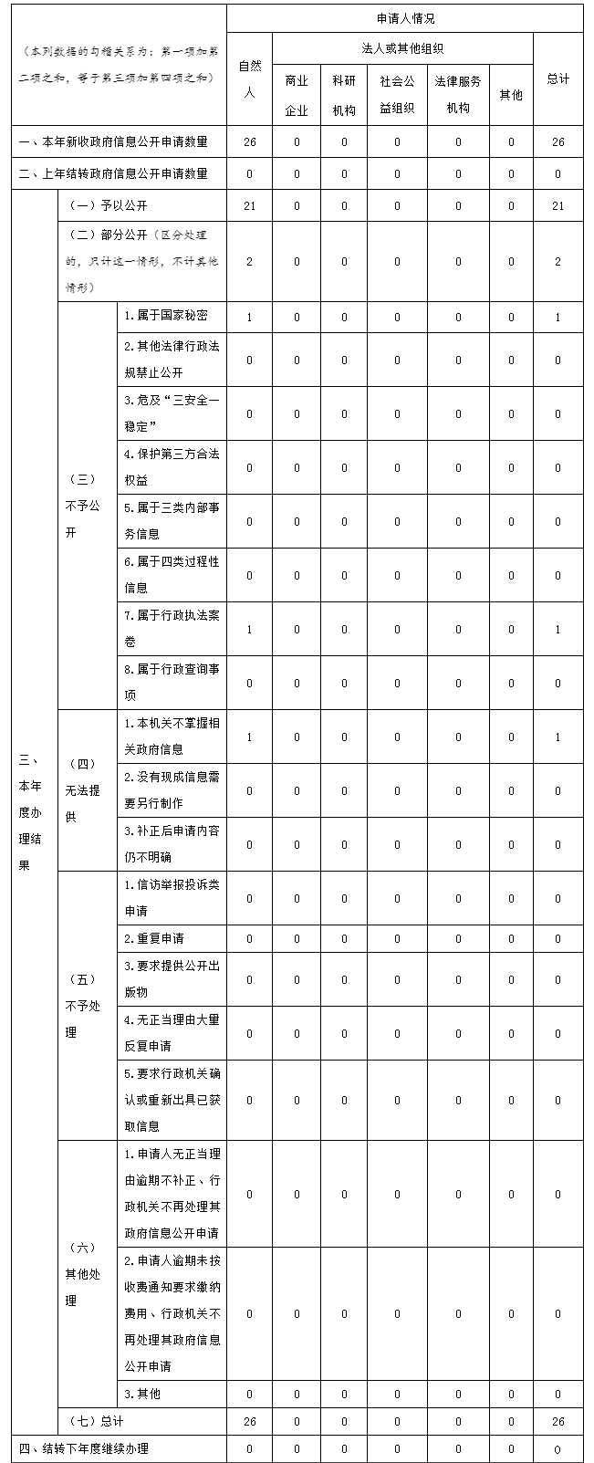 (二)依申請(qǐng)公開(kāi)情況。健全完善政府信息依申請(qǐng)公開(kāi)制度,指導(dǎo)全縣各單位規(guī)范依申請(qǐng)公開(kāi)答復(fù)程序和內(nèi)容,依法依規(guī)答復(fù)釋疑,辦理答復(fù)更加規(guī)范、高效、便民。全縣各級(jí)累計(jì)受理依申請(qǐng)公開(kāi)信件26件,按期規(guī)范答復(fù)26件,辦結(jié)率100%,全力保障了公眾申請(qǐng)信息需求。
